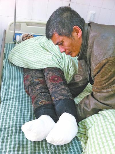 看着老人的双脚缠满了纱布,儿子王丛林心疼万分,他说当听到母亲的双脚被开水“烫熟”时,他赶紧打的赶到医院。